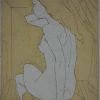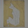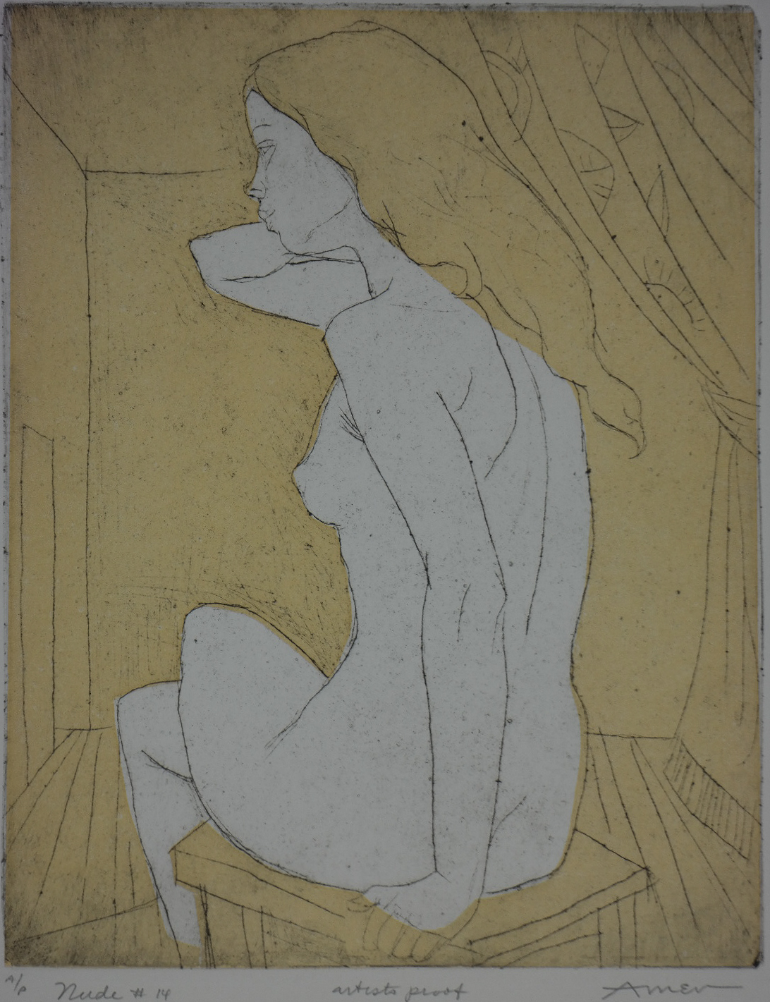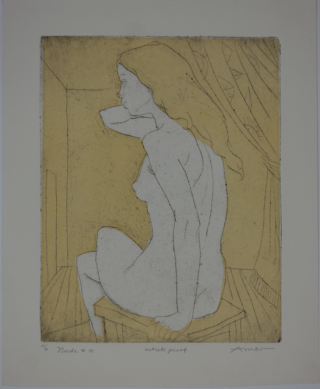 Note that this print is an artist’s proof, an experimental stage of the printmaking process. You can see a similar proof of a related image on irvingamen.com, next to an example from the regular edition. Oddly, those prints are listed as lithographs, a designation that seems incorrect or at least incomplete. It may be that Amen used a lithographic stone to produce the background yellow, and etching for the primary image. We do know that he sometimes combined linocut and etching in such a way.